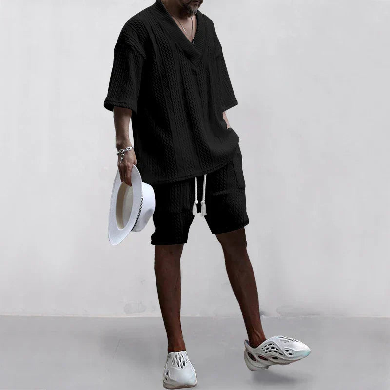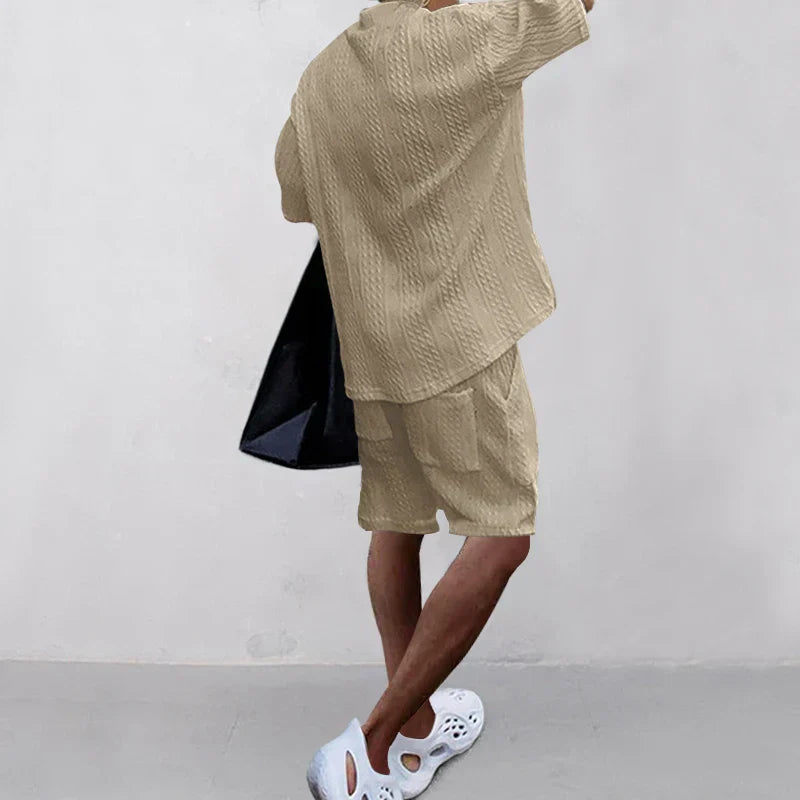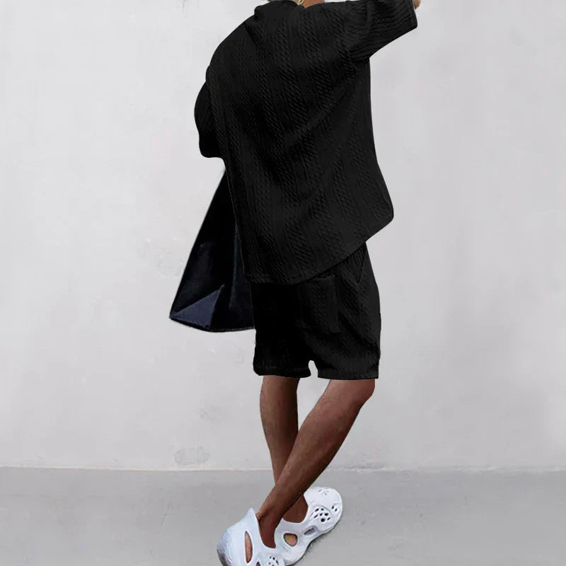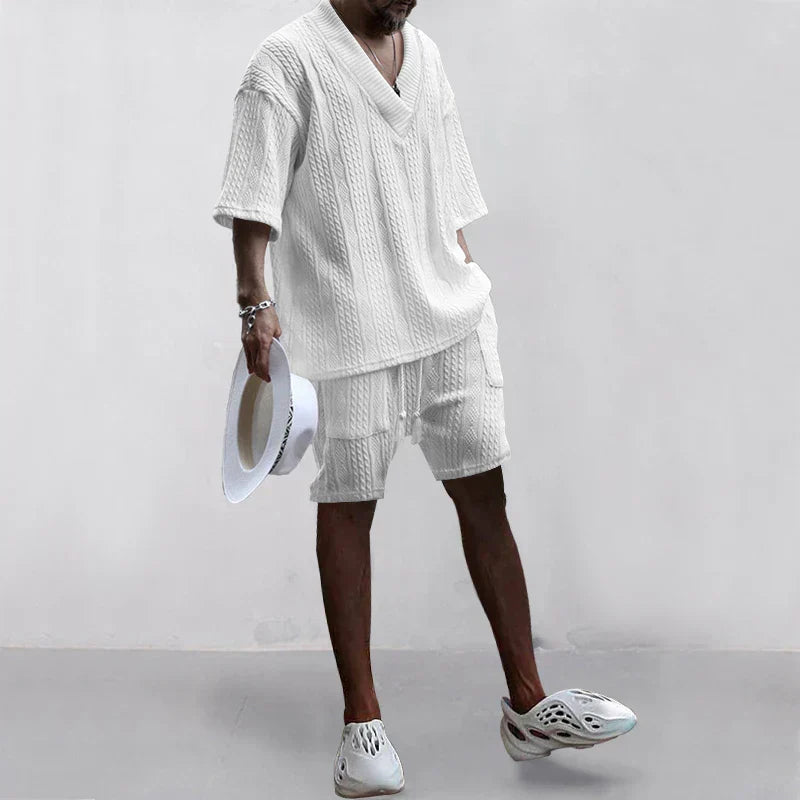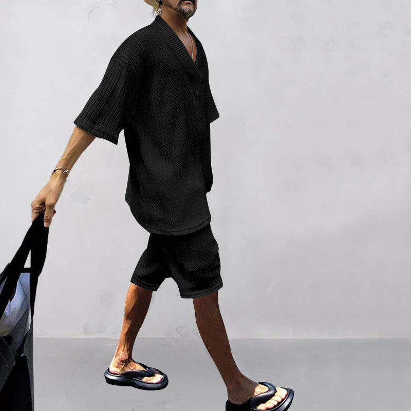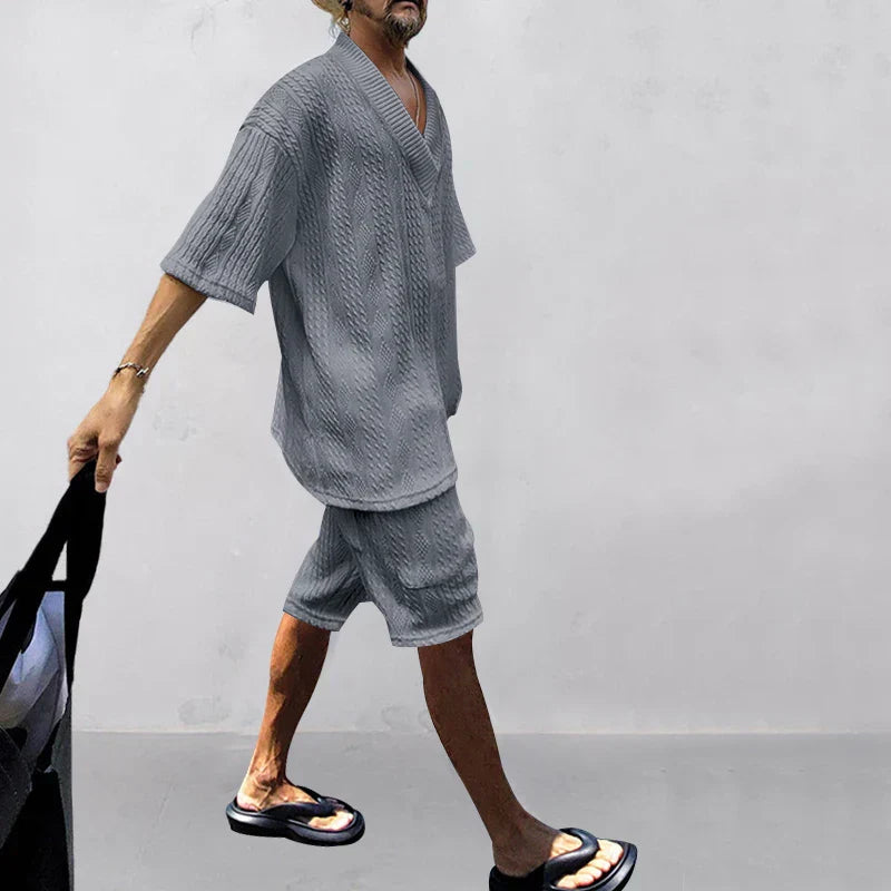 Autour d’un Style vous présente Détendu, l’ensemble deux-pièces en tricot qui incarne la douceur estivale avec une touche urbaine. Pensé pour les hommes en quête de confort stylé, Détendu™ vous enveloppe d’élégance tout en vous laissant libre de vos mouvements.